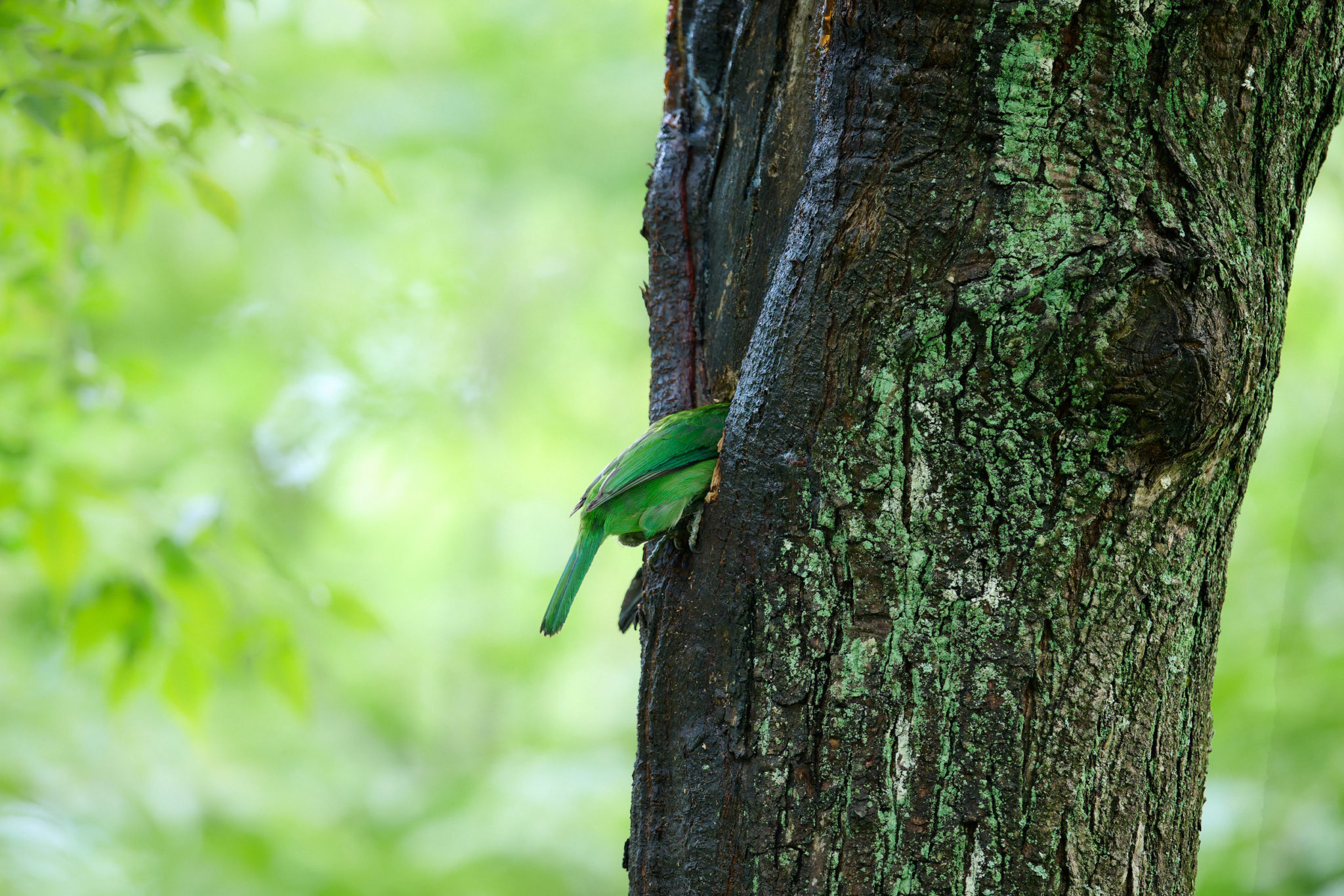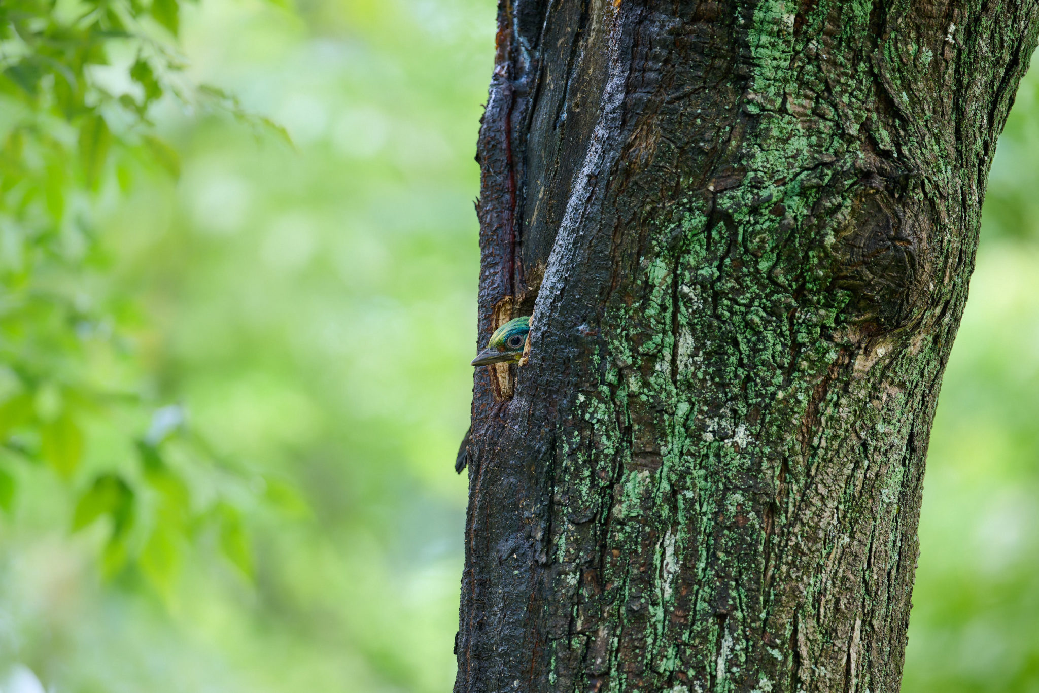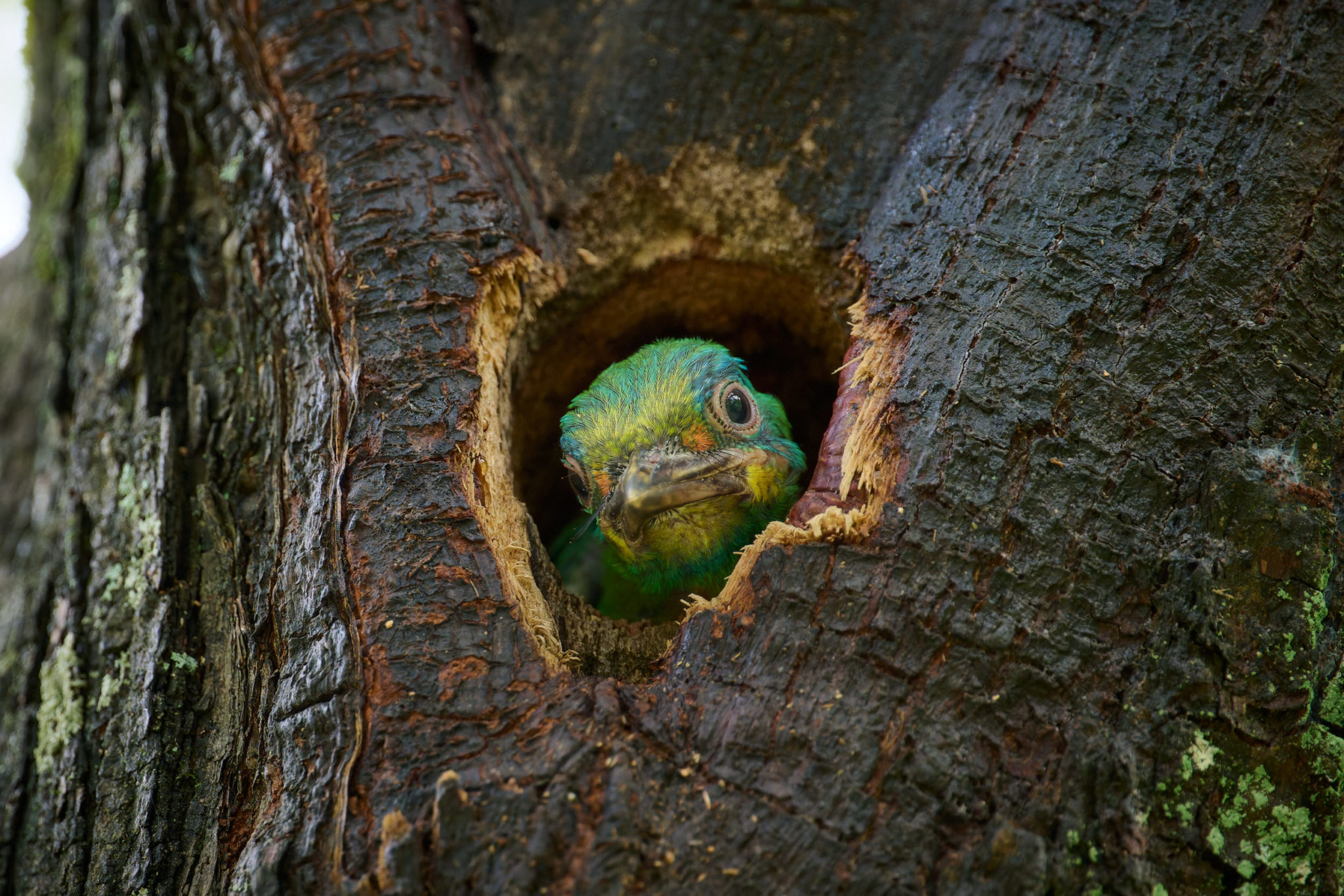 巣立ち前の幼鳥は、まだ全身の色彩が淡く、成鳥のような鮮烈なコントラストの青や赤はうっすらとした緑や褐色に覆われている。頭部の色分けも不明瞭で、羽毛はふんわりとした質感を残しているため、木の幹から顔をのぞかせる姿はひときわ愛らしい。