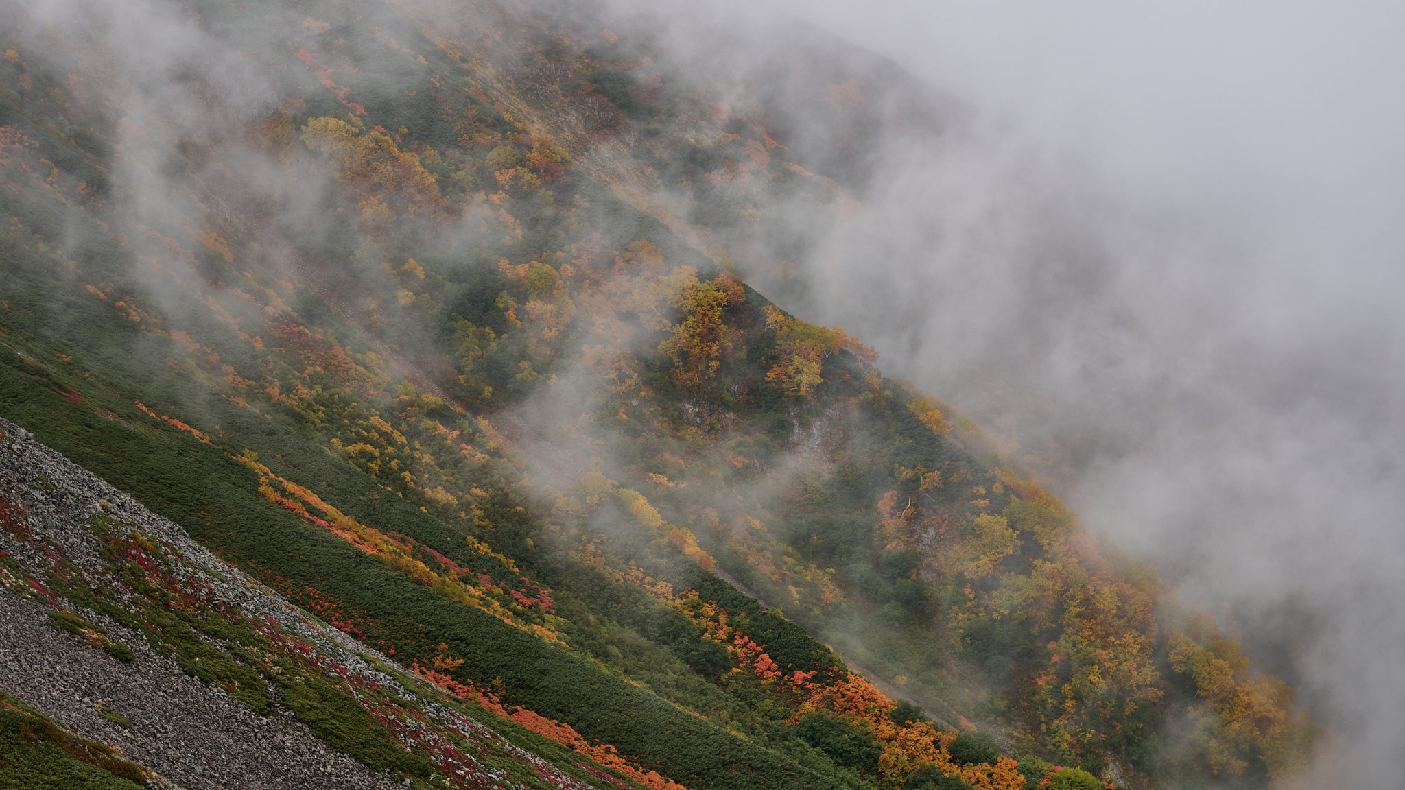 岩と草地が入り混じる斜面に緑と秋色がまだらに広がり、季節の進行に応じて粗野に剥き出している山肌の表情が魅惑的に変化してゆく。