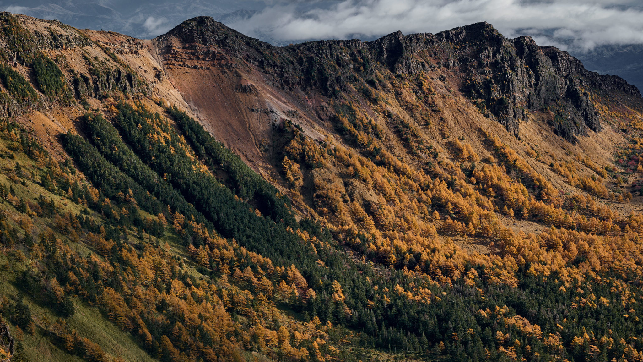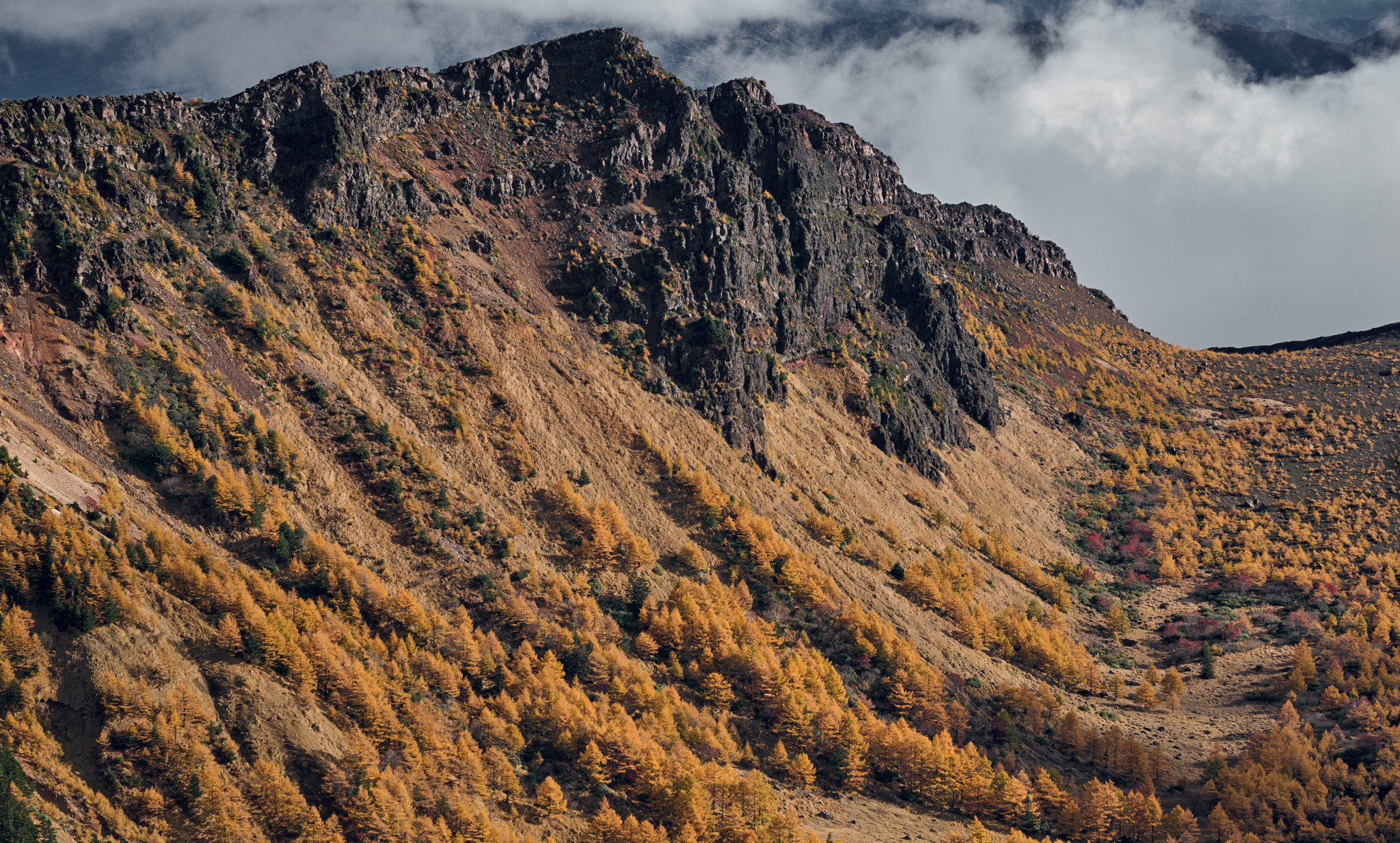 The outer rim of Mount Asama is formed by a curved line of peaks—Kurofu, Jakotsu, Sennin, and Nokogiri—encircling the volcano. The ridge can be followed as a traverse, and as you approach Nokogiri-dake, the distance to Asama narrows, bringing an increasing sense of scale and intensity. The presence of the volcano, along with the dark, rugged lava walls, fills your view and conveys a powerful atmosphere.