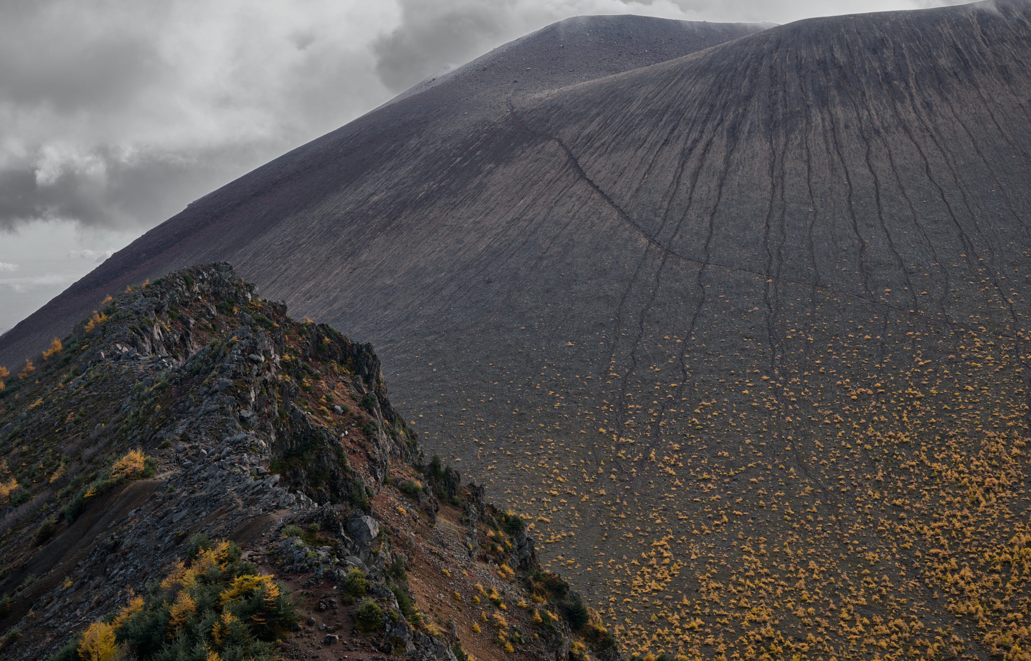 浅間外輪山は、黒斑山・蛇骨岳・仙人岳・鋸岳が、浅間山を包み込むよう弧状に連なる。稜線を辿り縦走することができ、とりわけ鋸岳へ近づくにつれて浅間山との距離が縮まり徐々に迫力が増してゆく。火山の気配や黒々とした溶岩壁の質感が、視界を満たし力強さを感じる。