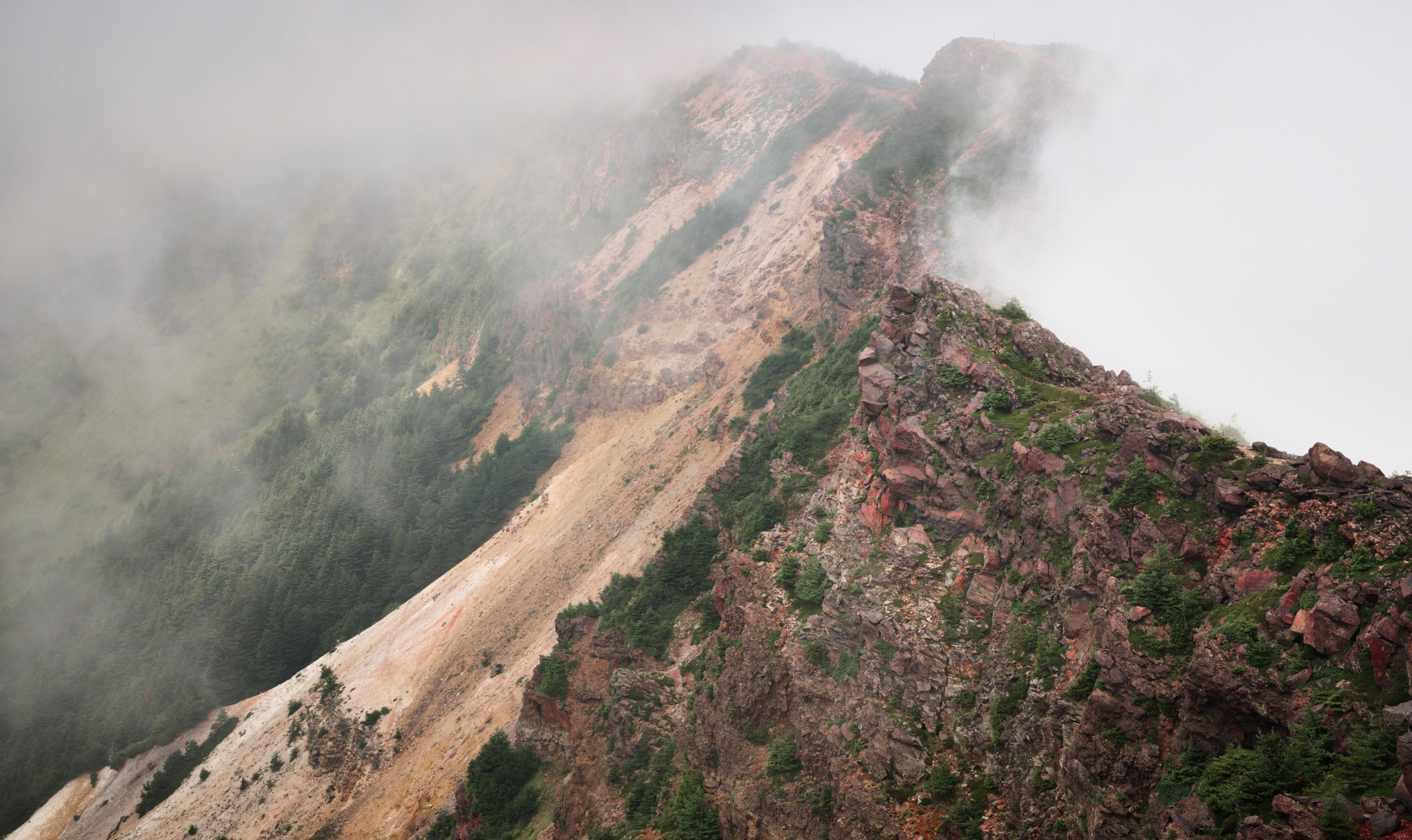 雄大な浅間山を背に歩を進めると、白霧に覆われた稜線が仙人岳、蛇骨岳へと続いている。火山帯特有の赤褐色の岩肌が広がり、噴火によって形成された荒々しい地形が目前に展開する。
