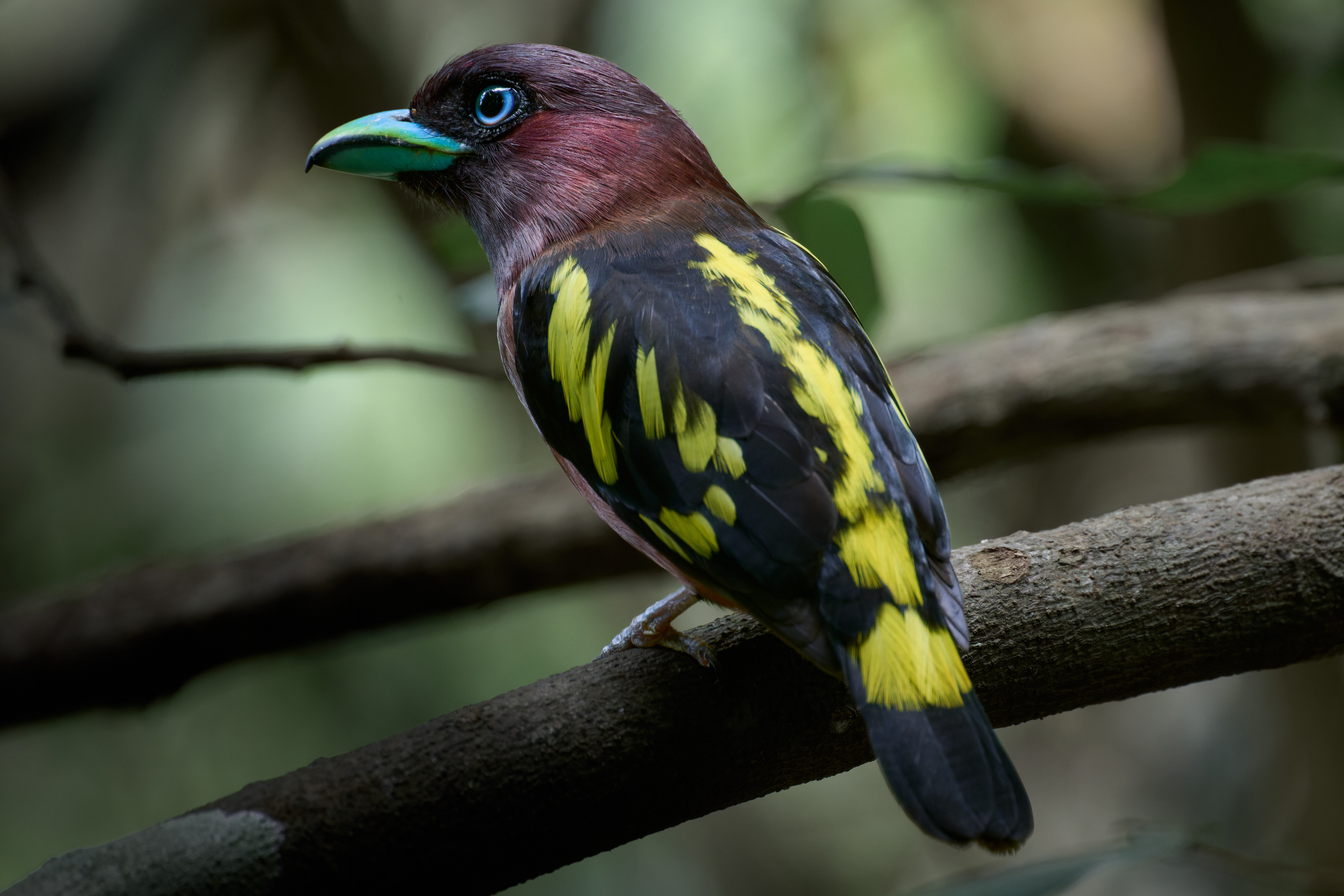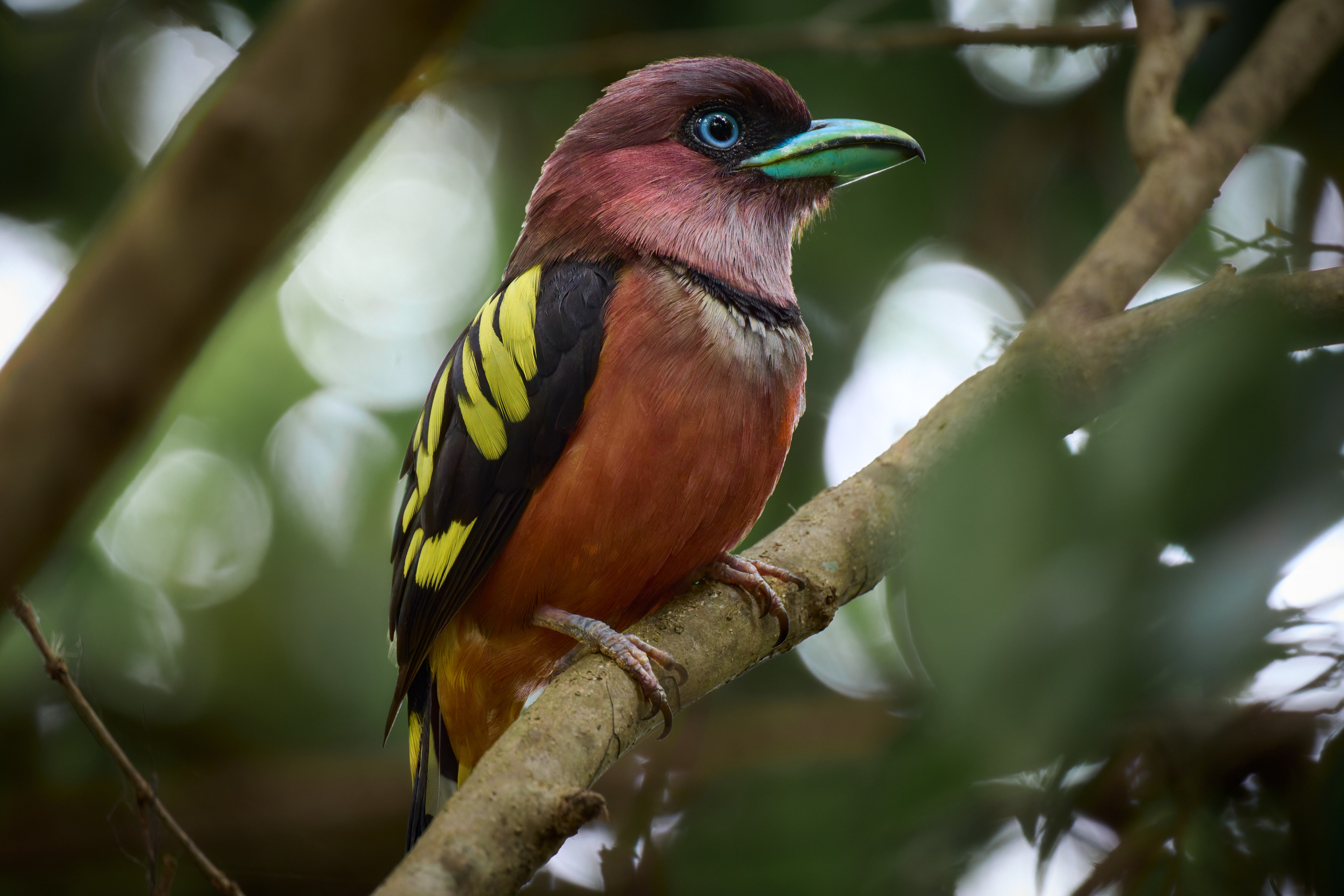 翼と上面にある黄色い斑点、淡いあずき色の頭部と腹部、そしてターコイズブルーの嘴と宝石のように澄んだ青い瞳(虹彩)が識別の要となる。幼鳥においては、頭部はよりくすんだ褐色で下面は灰白色の斑が散る。