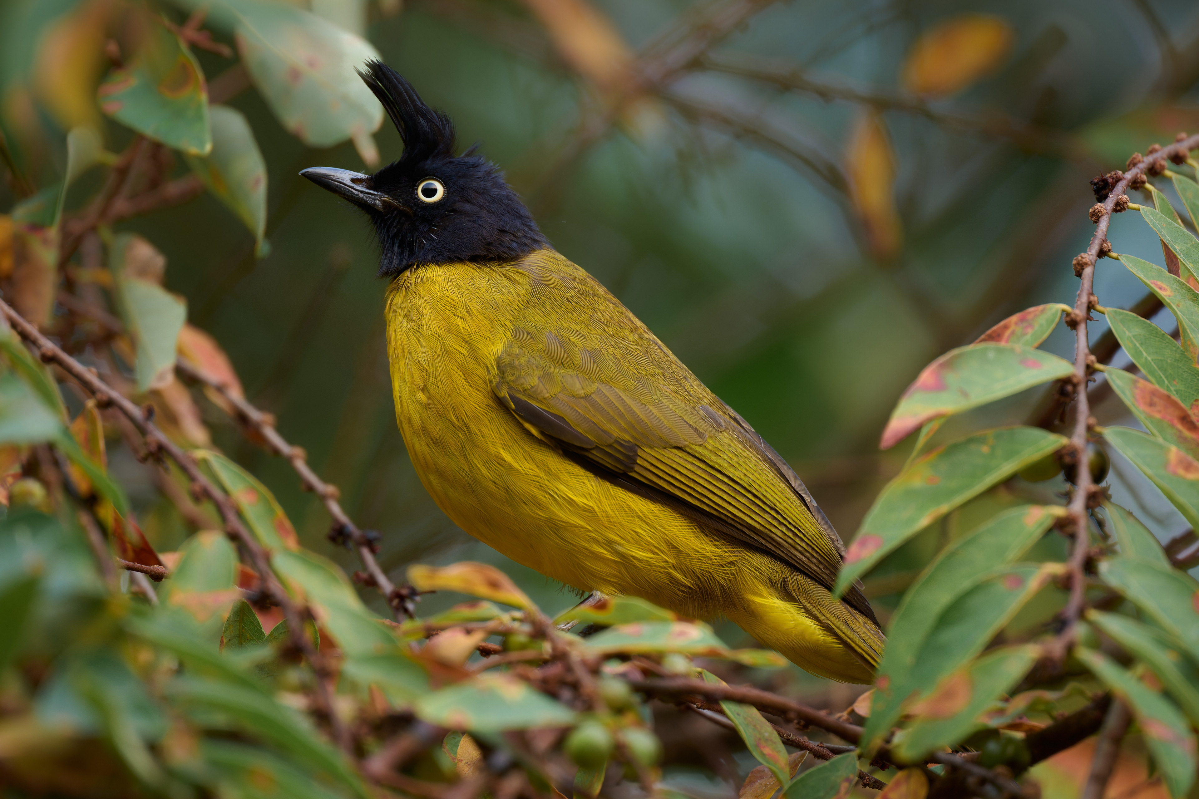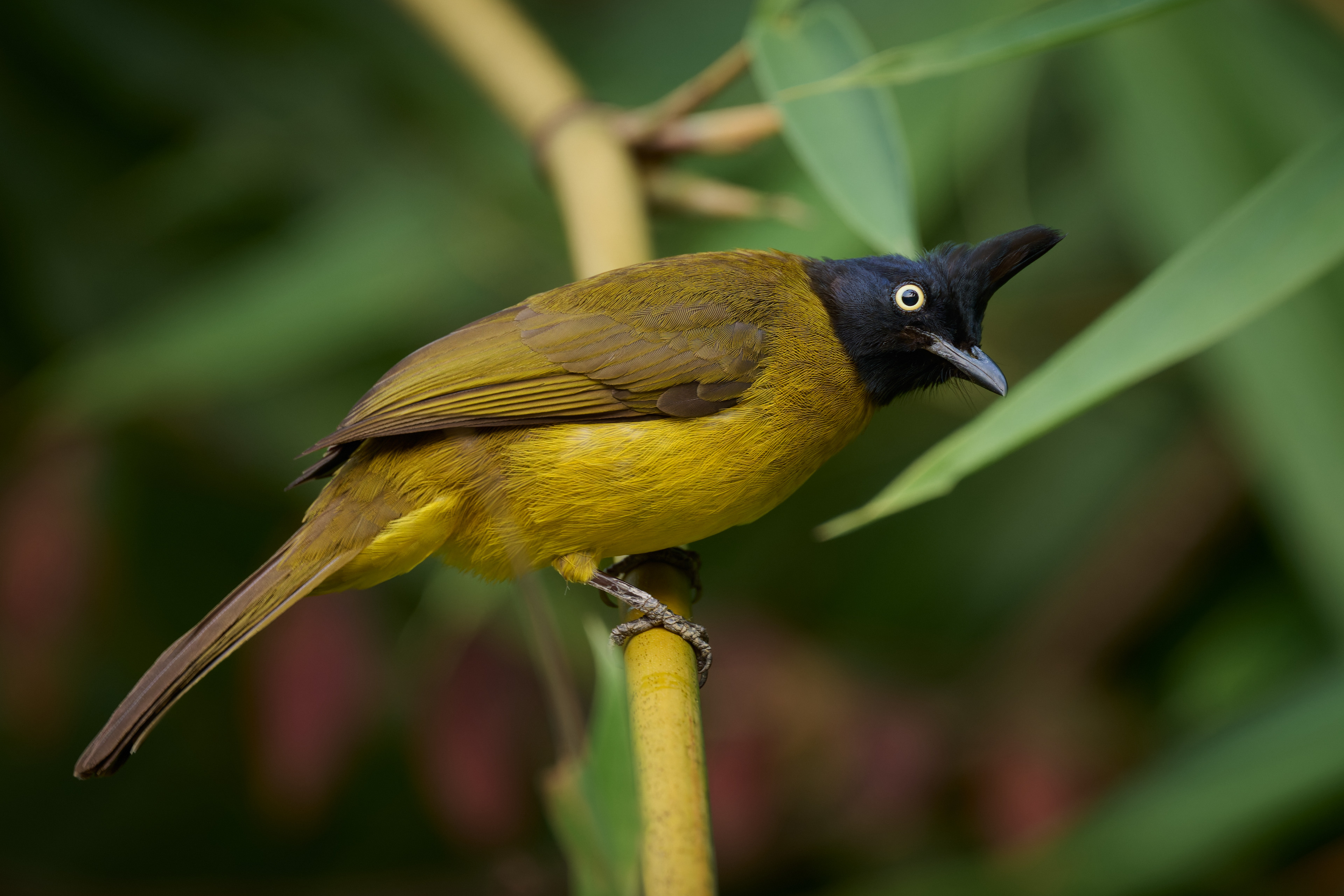 上面はオリーブ色で、下面は鮮やかな黄色。尾には特に目立った斑紋はない。虹彩は白色。東部地域の亜種では喉が赤色。