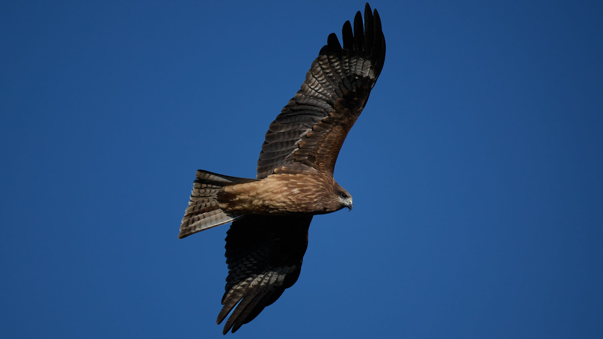 The Black Kite (Milvus migrans) is a medium-sized raptor of the family Accipitridae, measuring approximately 55–60 cm in length. Its long, broad wings form a distinctive V-shape in flight. Males and females are similar in appearance, with overall brown plumage and darker wing tips.