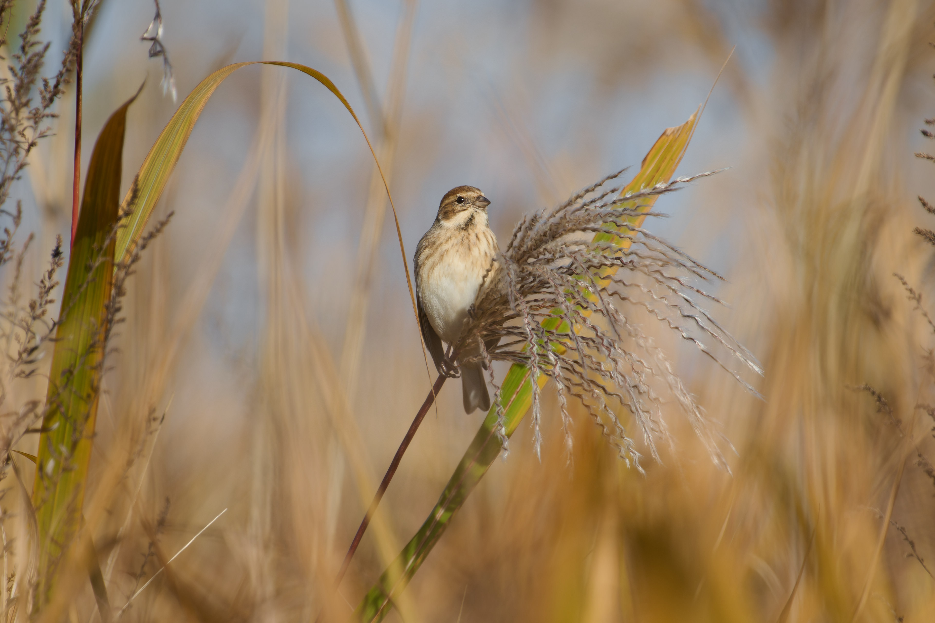 The Reed Bunting (Emberiza schoeniclus) is a small passerine of the family Emberizidae, measuring approximately 18 cm in length. It breeds across northern Eurasia and migrates southward for the winter. In Japan, it breeds in Hokkaido and northern Honshu, inhabiting coastal and riverside grasslands, pastures, and wetlands around rivers and lakes. From autumn through winter, it often forms small flocks of several to a dozen birds.
