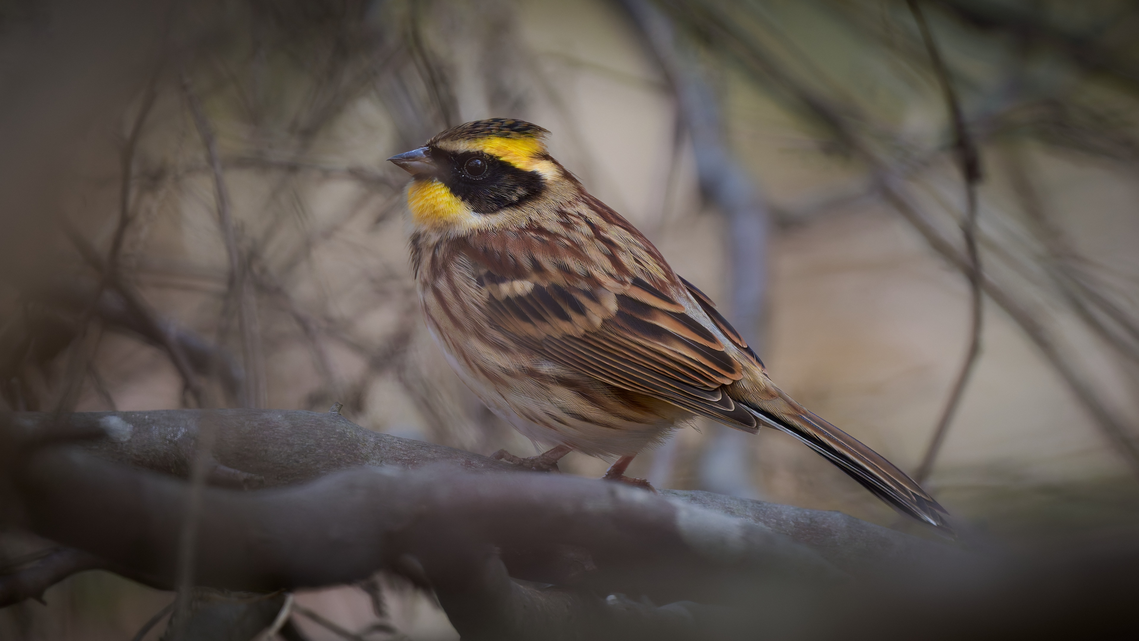 The Yellow-throated Bunting (Emberiza elegans) is a small passerine bird of the bunting family, measuring approximately 16 cm in length. While its overall plumage is dominated by subdued brown tones, adult males exhibit a vivid yellow throat and eyebrow stripe, sharply contrasted by black facial markings. Females are generally duller, with weaker yellow and reduced black patterning.